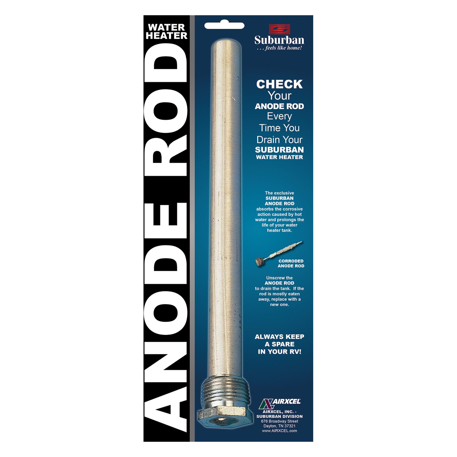 This genuine suburban anode rod is made of magnesium and will suit all models of suburban hot water systems. Be sure to inspect the water heater anode rod upon receipt. Anode rods preserve the life of a water heater by corroding themselves so the water heater doesn't. The dictionary answer is a sacrificial rod used mainly in water heaters. Suburban aluminum anode rod absorbs the corrosive action caused by hot and/or harsh water.